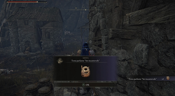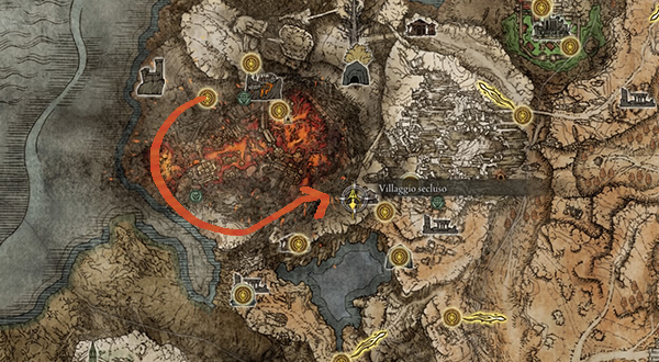 Per far sì che Boc sopravviva e rimanga al vostro fianco illeso, NON DATEGLI LA LACRIMA DI LARVA. Vi servirà invece un oggetto aggiuntivo abbastanza facile da reperire. Procuratevelo dunque prima di iniziare a chiacchierare con lui. Si tratta della Testa Parlante “Sei incantevole”, che potrete trovare presso il Villaggio Escluso che vedete qui sotto nella mappa. Per raggiungerlo dovrete fare un bel giro andando a sud ovest di Villa Vulcano per poi proseguire spediti verso est. Una volta ottenuto l’oggetto, tornate da Boc e usatelo davanti a lui.