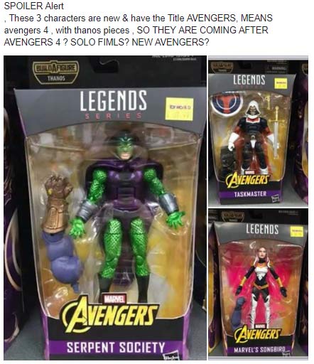 Le nuove action figure Hasbro non finiscono qui. Insieme ad altre statuine brandizzate Avengers: Infinity War, alcuni utenti hanno fotografato una linea particolare di action figure, sempre appartenenti alla linea Legends e all’interno delle quali è presente un pezzo della action figure di Thanos (acquistandole tutte potete costruire l’altra figura, cosa ormai consueta). Queste action figure, però, non c’entrano nulla con Infinity War, ma riportano la dicitura degli Avengers. Tra questi personaggi ci sono Songbird, Taskmaster e Serpent Society (curiosamente, Civil War venne inizialmente presentato come Captain America: Serpent Society), e qualcuno suggerisce che la Marvel abbia promosso questa nuova linea per iniziare a preparare il terreno post-Fase 3. Sarà così?