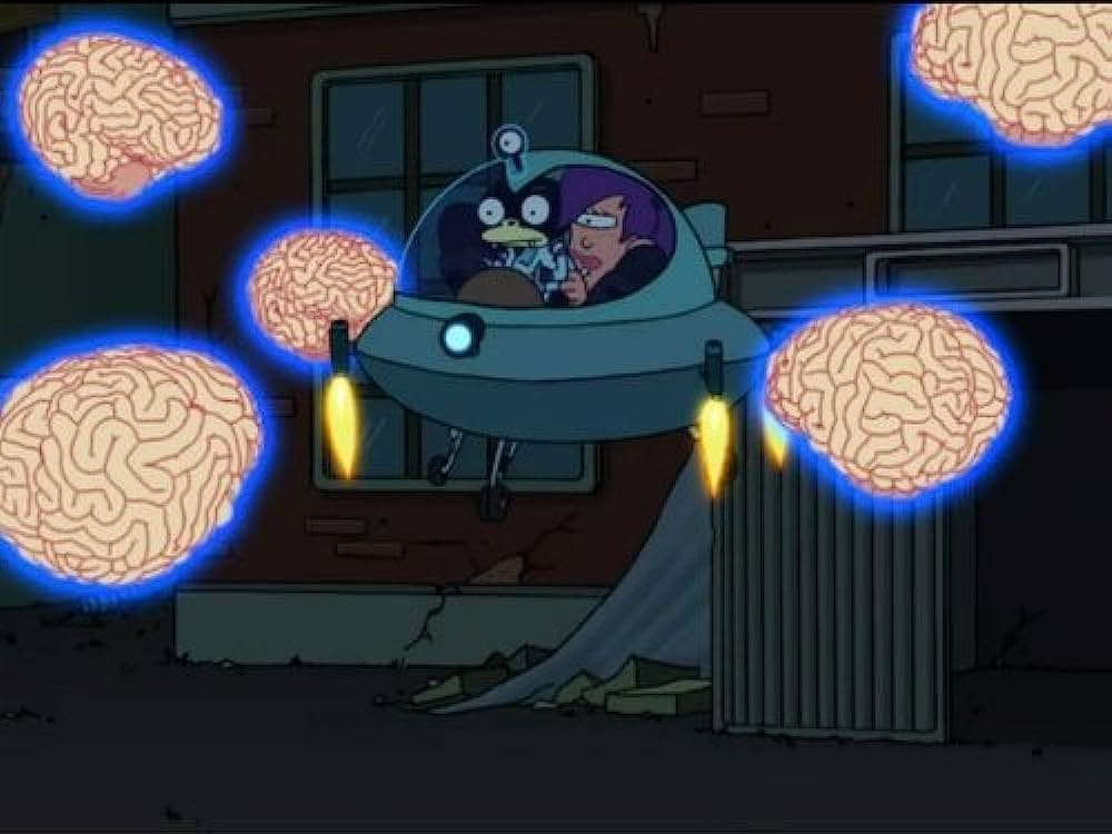 Quello che segue, nella seconda parte dell’episodio, è un mix di follia e risate continue. Tra i Cervelli che stanno velocemente intontendo tutte le persone della Terra (anche Bender ne è colpito, vai a capire perché!) e Fry che riesce a essere abbattuto persino da un piccione, Leela riceve dai Mordicchiani il compito di tornare sul pianeta e proteggere a tutti i costi l’unica speranza per sconfiggere i Cervelli: proprio Fry. Essendo sprovvisto delle onde cerebrali delta (il motivo verrà approfondito nella seconda parte di questa guerra tra i Mordicchiani e i Cervelli, nell’episodio 5×08 Il perché di Fry), il ragazzo è infatti l’unica speranza dell’universo per fermare i folli esseri assetati di conoscenza.