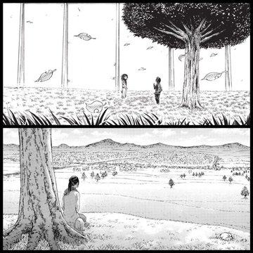 Gli ultimi pannelli sono dedicati a Mikasa, che si ritrova sotto lo stesso albero che ci viene mostrato all’inizio de L’Attacco dei Giganti. È lì che la ragazza ha deciso di far riposare Eren, in un luogo che è ora privo di mura e mostra un paesaggio aperto, sconfinato. La ragazza indossa ancora la sua sciarpa e non si è affatto data pace per la morte dell’amato, che passa la vita a vegliare. Il dolore è mitigato dall’apparizione di uno jaeger, un uccello marino cacciatore che avvolge nuovamente l’iconica sciarpa rossa al collo della ragazza. Questo ultimo atto finale simbolico può essere interpretato in due modi opposti: può rappresentare l’anima di Eren che è finalmente libero e che comunque non abbandona Mikasa, oppure l’ennesima volontà del ragazzo di non lasciarla andare e di mantenere sempre vivo il ricordo di sé in lei (l’uccello non le toglie la sciarpa, ma invece gliela avvolge nuovamente).