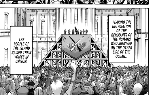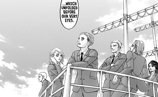 La guerra non è ancora finita. Tre anni dopo la “Battaglia del Paradiso e della Terra”, ritroviamo i sopravvissuti (gran parte del cast principale in realtà) intenti a tornare verso l’Isola di Paradis come eroi e ambasciatori di pace. Il mondo è infatti ancora solcato da venti di guerra: gli Jeageristi sono sopravvissuti e rappresentano molto probabilmente la più grande forza militare, dopo che gran parte della popolazione esterna a Paradis è stata sterminata da Eren. Gli Eldiani sono ancora profondamente segnati dall’odio e dall’oppressione del resto del mondo e temono nuove persecuzioni. Serve una fazione neutrale che, avendo vissuto in prima persona la follia del pregiudizio e della conseguente guerra, mantenga il fragile equilibrio del mondo. Per questo Jean, Connie, Armin, Annie, Reiner e Pieck altri si ritrovano insieme come delegazione di pace, mentre Levi (probabilmente a Liberio), viene assistito da Falco e Gabi e si prepara anche lui a dare la propria testimonianza al mondo. Gli acerrimi nemici si riuniscono anche sul finale per diventare rappresentanti di pace e appianare i conflitti, così come loro stessi avevano fatto (non senza dolori e rimpianti) sedendosi davanti a un falò nel capitolo 127.