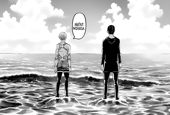 La svolta nel personaggio di Eren avviene quando il ragazzo confessa effettivamente i suoi sentimenti per Mikasa, che erano sempre rimasti sottesi, non detti e anzi, calpestati nell’arco conclusivo della storia. Il ragazzo di fatto prova per Mikasa un’intensa gelosia, tanto da dichiarare di non voler morire per poter stare ancora con lei, e di rifiutare che la ragazza riesca a guardare oltre e a trovare un nuovo amore dopo di lui. Nonostante ciò, il piano è ormai in atto e non c’è più modo di fermarsi. Eren si mostra comunque fragile nel suo ultimo capriccio verso Mikasa, alla quale non ha mai dichiarato apertamente alcun tipo di amore o di attaccamento morboso, cosa che invece è sempre stata ben evidente da parte della ragazza. Questa svolta nel personaggio di Eren può aver fatto storcere il naso a non pochi lettori, ma va considerata per quello che è: l’ultimo grido di dolore di un ragazzo che non vuole morire. Eren è rimasto il bambino testardo, capriccioso, arrabbiato e sognatore che è sempre stato: in questo il personaggio non perde di coerenza, nonostante dichiari un sentimento con parole delle quali anche lo stesso Armin, incarnando un po’ i lettori, si stupisce.