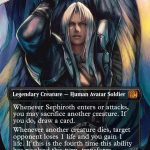 FFVII, in quanto uno dei capitoli più amati e conosciuti, ci porta poi delle perle come Cloud, sia come carta standalone che come Commander del mazzo dedicato, Tifa, Aerith e un’incredibile Sephiroth, altra carta con due lati