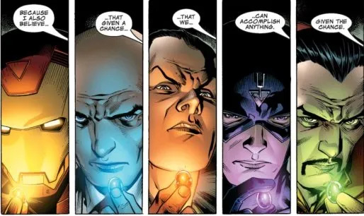 Poco dopo la Guerra Kree-Skrull, uno degli eventi cosmici più importanti della storia editoriale Marvel, Tony Stark convocò alcuni “colleghi” per un incontro segreto volto alla formazione di un nuovo gruppo di superumani. Stark riteneva infatti che i presenti, con le loro conoscenze, avrebbero potuto anticipare la minaccia dell’invasione aliena e salvare molte vite. Nonostante le iniziali titubanze, relative soprattutto alla sempre delicata obiezione per quanto riguarda il rischio di mettere troppo potere nelle mani di poche persone, seppur intelligentissime, il concilio voluto da Stark raggiunge il suo scopo. Nascono così gli Illuminati.
