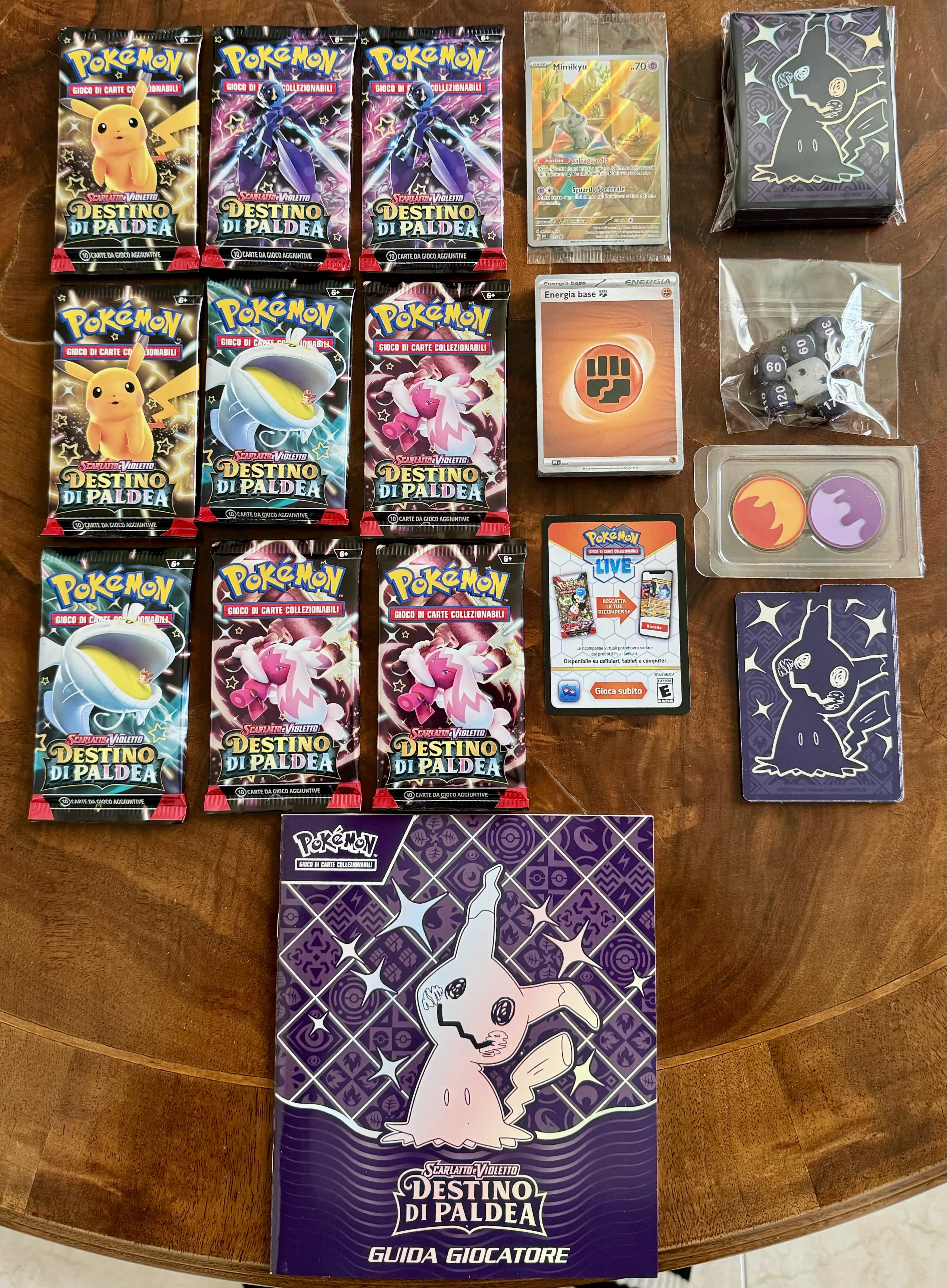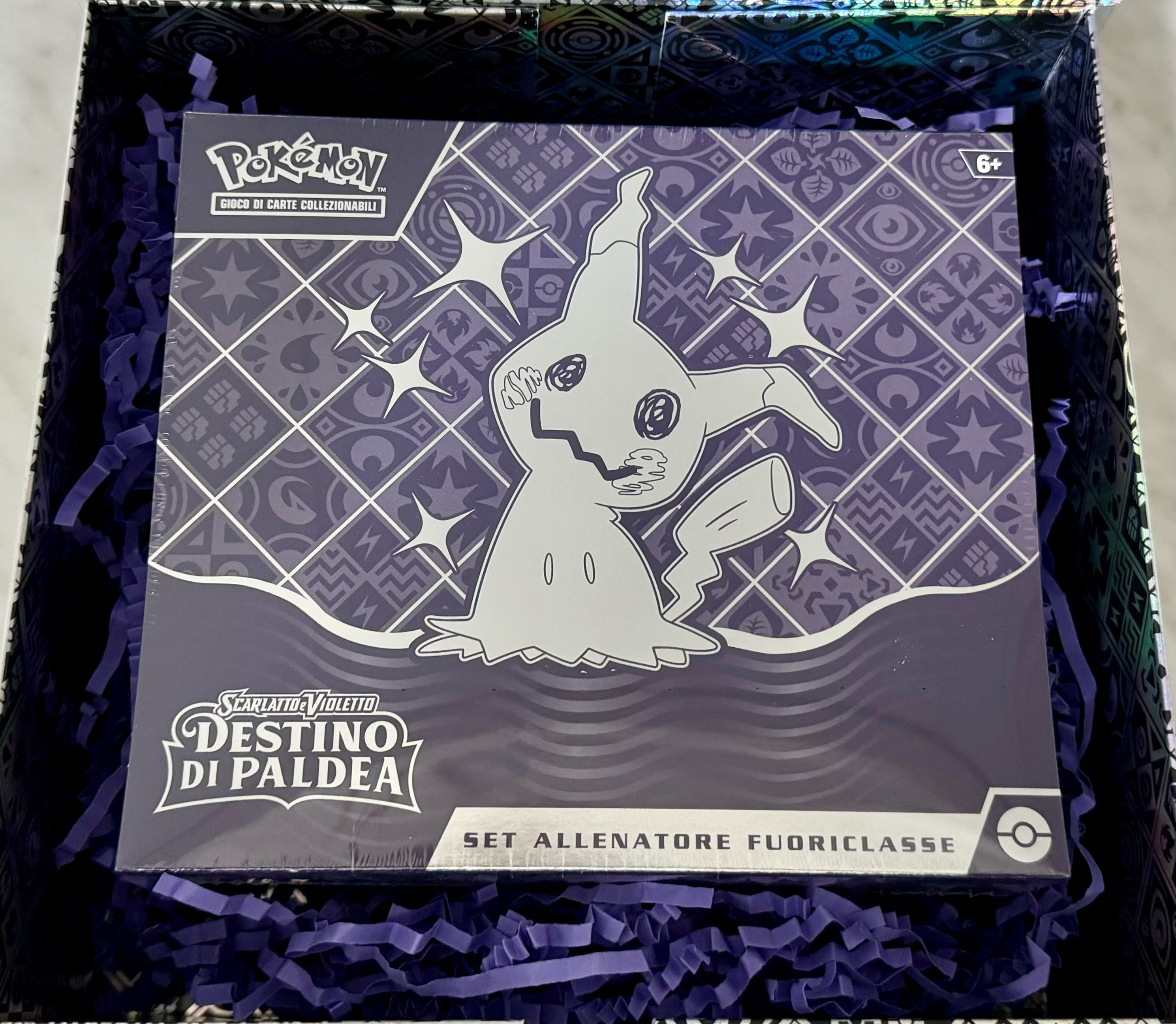 - Set Allenatore Fuoriclasse dell’espansione Scarlatto e Violetto – Destino di Paldea, che include nove buste di questa espansione, una carta promozionale in stile rara, illustrazione di Mimikyu in versione cromatica e vari accessori di gioco.