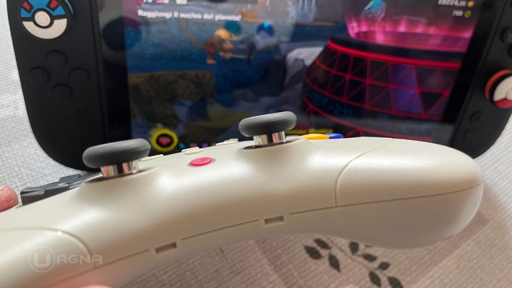Il retro è completamente liscio, privo di texture antiscivolo o grip gommati: una scelta coerente con il look rétro, ma che sacrifica un po’ di comfort nella presa. I pulsanti frontali sono ben posizionati e facilmente raggiungibili, merito anche delle dimensioni ridotte del controller. I pollici cadono naturalmente sul D-pad e sui tasti ABXY, e chi predilige titoli a scorrimento laterale o fighting game apprezzerà particolarmente questa disposizione. Gli stick analogici, invece, sono leggermente più piccoli della media e risultano più bassi, quindi meno comodi per chi è abituato a una presa più profonda. Ci sentiamo di evidenziare anche l’eleganza con la quale la levetta dello stick, quella che sorregge la parte in gomma, è in metallo lucido: non ne abbiamo visti tanti, in precedenza.