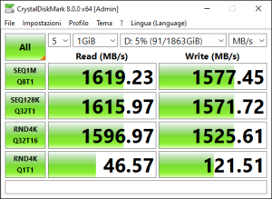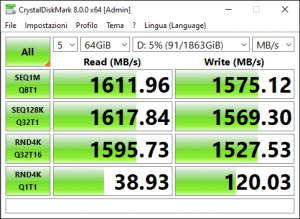 Stando a quanto evidenziato da CrystalDiskMark, da anni tra i programmi più affidabili per i benchmark su memorie, anche su un sistema non aggiornatissimo la velocità si mostra ed è in linea con le previsioni che si vanno a fare per una MOBO con PCIe di scorsa generazione, i test singoli di trasferimento di cartelle da circa 80 GB ciascuna è terminato in appena 48.52 secondi, con una media approssimativa di 1.6 GB/s; nell’utilizzo quotidiano promuoviamo assolutamente questo SSD che si rivela un perfetto dispositivo a cui affidare i nostri dati.