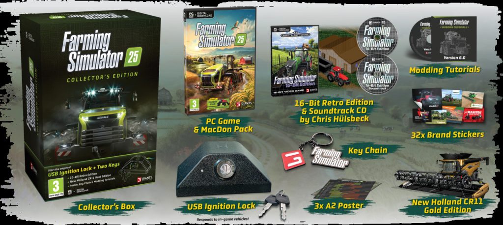 Gli appassionati di agricoltura dovrebbero dare un’occhiata alla Farming Simulator 25 Collectors’ Edition: questa versione esclusiva per PC include un blocchetto di accensione USB per avviare i motori dei trattori nel gioco, una versione ispirata al Mega Drive a 16 bit, un CD della colonna sonora con 15 brani originali di Chris Hülsbeck per gli amanti del retrò e molto altro ancora.
