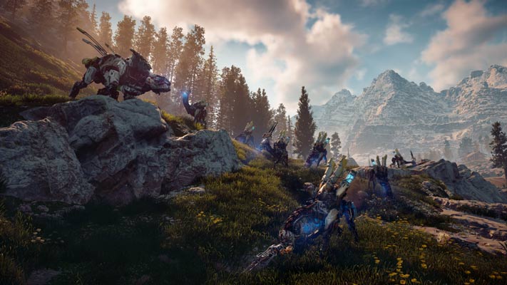 Il setting di Horizon: Zero Dawn è particolarmente interessante e suggestivo. Ci troviamo in un lontano futuro, nel quale le società civilizzate sono state abbattute dalla ribellione delle macchine. Come nel più apocalittico Terminator possibile, i robot hanno infatti sviluppato intelligenze artificiali talmente potenti da essere diventati le “forme di vita” dominanti del pianeta, cosa che ha costretto gli umani a riorganizzarsi in tribù e a regredire notevolmente, come abbiamo visto dalle immagini e dai trailer di gioco: l’impressione sarà quella di una società neolitica, capace di costruire insediamenti e di utilizzare armamenti e conoscenze per sopravvivere. Ancestrali anche i culti religiosi e i riti legati alla “Madre”, una guida spirituale che accompagnerà la protagonista nel corso di tutto il suo viaggio nel pericoloso mondo dominato dalle macchine ribelli. Maestose e imperiali alcune, piccole e pericolosissime altre. La varietà di nemici è molto ampia, e con essa anche la scelta di tattica da adottare in specifici contesti.