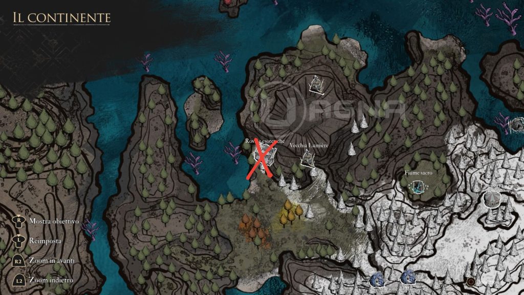 6. Rovine esoteriche. Incontrerete un globo azzurrognolo, aiutatelo a ritrovare il suo corpo. Per farlo, esplorate a fondo l’area e superate il piccolo enigma ambientale delle torce (non è difficile, vi basterà qualche tentativo per arrivare dall’altra parte del breve labirinto). Nell’area seguente, troverete il loot viola. Tornate all’ingresso a parlare con il Nevron, consegnandogli le tavole di legno che avete trovato per ridargli una forma.