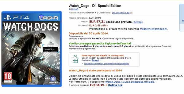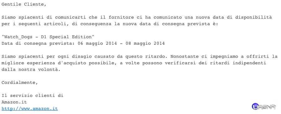 Amazon ha iniziato a inviare email come questa a tutti coloro che avevano pre-ordinato Watch Dogs. Nulla di particolarmente importante, se non fosse che Amazon, nella mail, prevede di poter consegnare il gioco intorno al 6-8 maggio 2014.