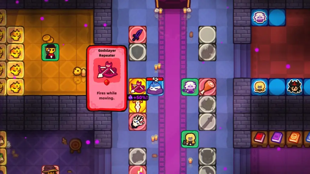 Un discorso analogo si può fare per i potenziamenti e le build costruibili durante ogni partita. Gli oggetti disponibili sono numerosi (circa 200) e le build possibili sono diverse: da quella concentrata sul lancio degli shuriken, con tutti i potenziamenti annessi, a una build basata sul fuoco, fino alla build “invincibilità”, quest’ultima è probabilmente la più forte del gioco, vista la sua capacità di creare una serie di turni di invulnerabilità che permettono l’annullamento completo degli attacchi avversari.