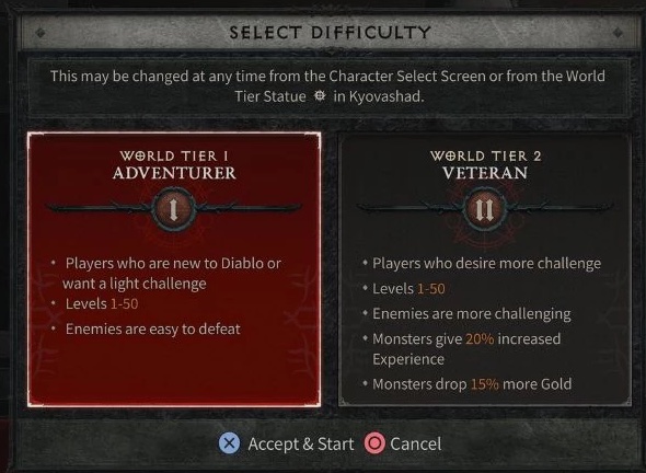 Prima di partire definitivamente per Sanctuarium, Diablo 4 richiede un’ultima decisione, quella relativa alla difficoltà del mondo. Fortunatamente in questo caso sarà possibile, a differenza di Softcore ed Hardcore, modificare l’impostazione in qualsiasi momento. Rappresentata come “Livello del mondo” la complessità degli avversari che si potrà scegliere influirà in diversi parametri.