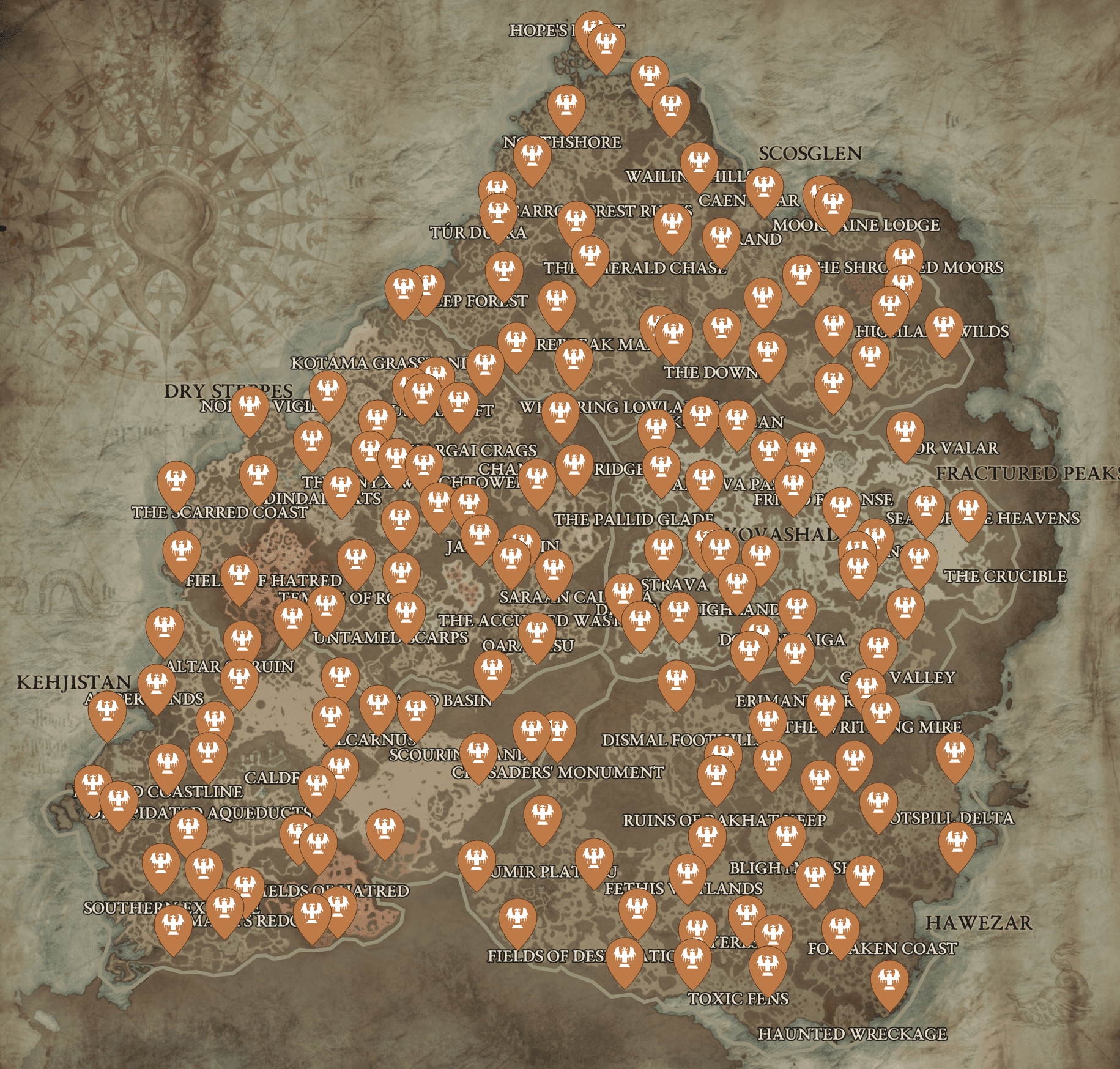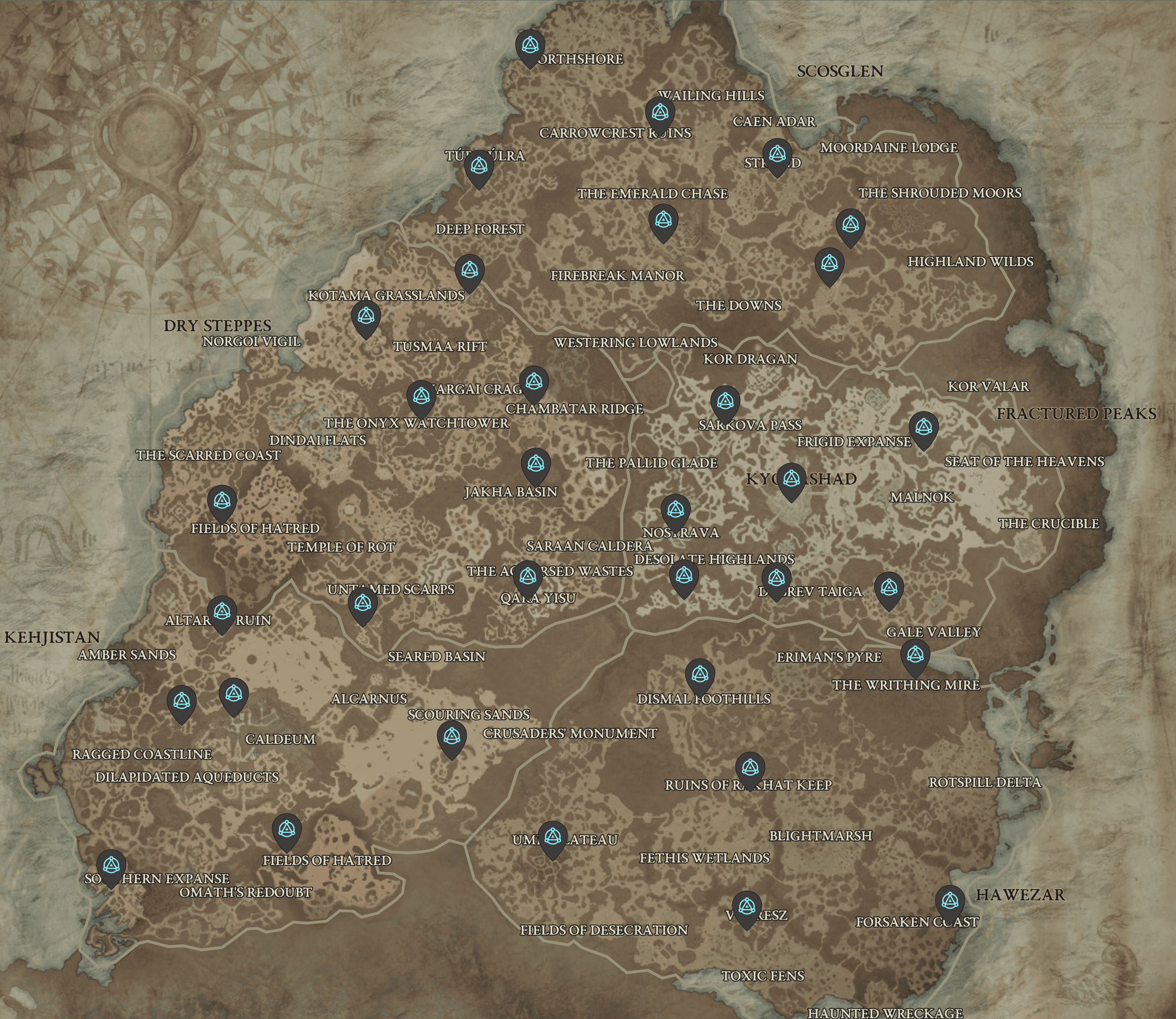 Come nei precedenti capitoli della saga, anche su Diablo 4 sono presenti numerosi Crocevia che, se attivati, consentiranno di viaggiare rapidamente all’interno del mondo di gioco (naturalmente impostando come destinazione dei punti precedentemente raggiunti). Questi sono 34 in totale e sono così suddivisi: