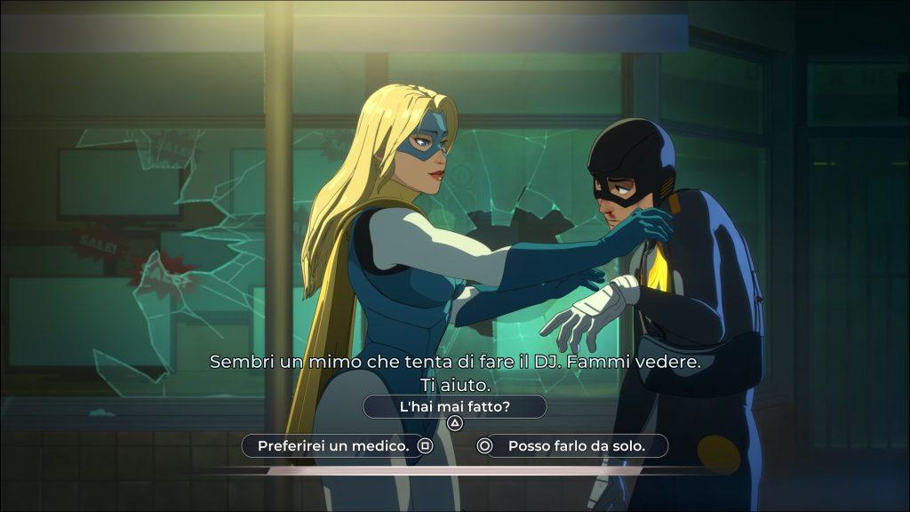 Della storia vi abbiamo parlato, ma come si gioca a Dispatch? Il titolo offre un interessante mix tra elementi gestionali, dialoghi a risposta multipla e quick time events (anche questi si possono disattivare a inizio partita, per godersi le cutscenes senza elementi interattivi). Non ci siamo ancora ritrovati davanti a scelte morali significative, ma siamo fiduciosi. Già nei primi due episodi, densi di tutorial, abbiamo affrontato scene di combattimento e situazioni complesse: Dispatch riesce a rendere veloce, dinamico e interattivo un genere dove spesso basta rilassarsi e godersi la storia. Tutto questo facendoci sorridere più e più volte, in un continuo di sagaci battute e incontri curiosi.