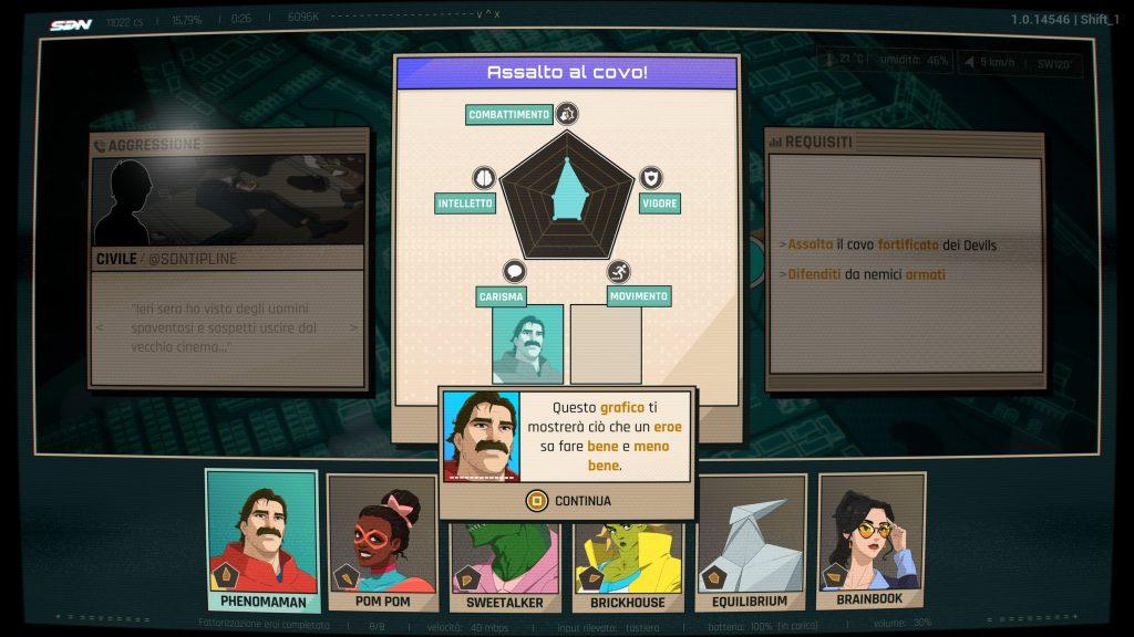 Conosciuta la nostra fulgida Blonde Blazer, Robert viene condotto al Superhero Dispatch Network (SDN), un vero e proprio “centro smistamento” per supereroi. È in questo ufficio che dovremo imparare il nostro nuovo lavoro, tutt’altro che semplice: monitorare la città e inviare il supereroe più adatto a risolvere varie emergenze. Durante il tempo limitato del nostro turno, avremo davanti la mappa della città sulla quale compariranno per un breve tempo gli avvisi d’emergenza: ogni supereroe a nostra disposizione è dotato di diverse capacità, c’è chi è più resistente, chi è più carismatico, chi è in grado di correre sul posto più velocemente, chi usa il cervello e chi preferisce invece menare le mani. Sta a noi interpretare correttamente ogni situazione e sfruttare al meglio la nostra squadra, gestendo tempistiche e capacità degli eroi. O meglio, degli anti-eroi, dato che spesso ci troveremo tra le mani degli ex villain passati dalla parte della legge, con la spiccata tendenza a mettersi nei guai!