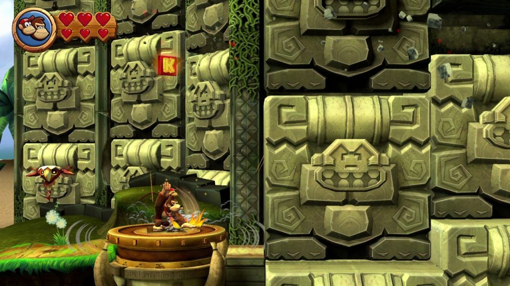 A differenza di un Super Mario bidimensionale qualsiasi, così, Donkey Kong Country Returns amalgama una serie di meccaniche che devono essere integrate con la progressione, più lenta e ragionata rispetto a quella dell’idraulico in quanto occorre anche capire in varie occasioni come procedere nel livello. Capita ad esempio di dover rompere casse o blocchi di pietra sul proprio cammino coi poderosi colpi del gorillone per eccellenza, o anche di dover soffiare via fiori o spegnere il fuoco abbassandosi – questo, in alcuni momenti, è un po’ fastidioso poiché il comando non sempre tende a partire correttamente, e forse è anche per questo che Tropical Freeze ne fece a meno.
