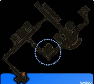 Per il secondo ingrediente dovrete trovare la Tibia di Leoric. Si trova nell’atto I, dalla 9 quest in poi, nella Villa di Leoric. Vi ritroverete fuori dalla villa, dovrete rientrare e seguire il sentiero mostrato nell’immagine. Arrivati nella stanza, in fondo troverete un caminetto con sopra una foto. Se nel caminetto ci sarà della legna cliccabile, avrete ottenuto la tibia.
