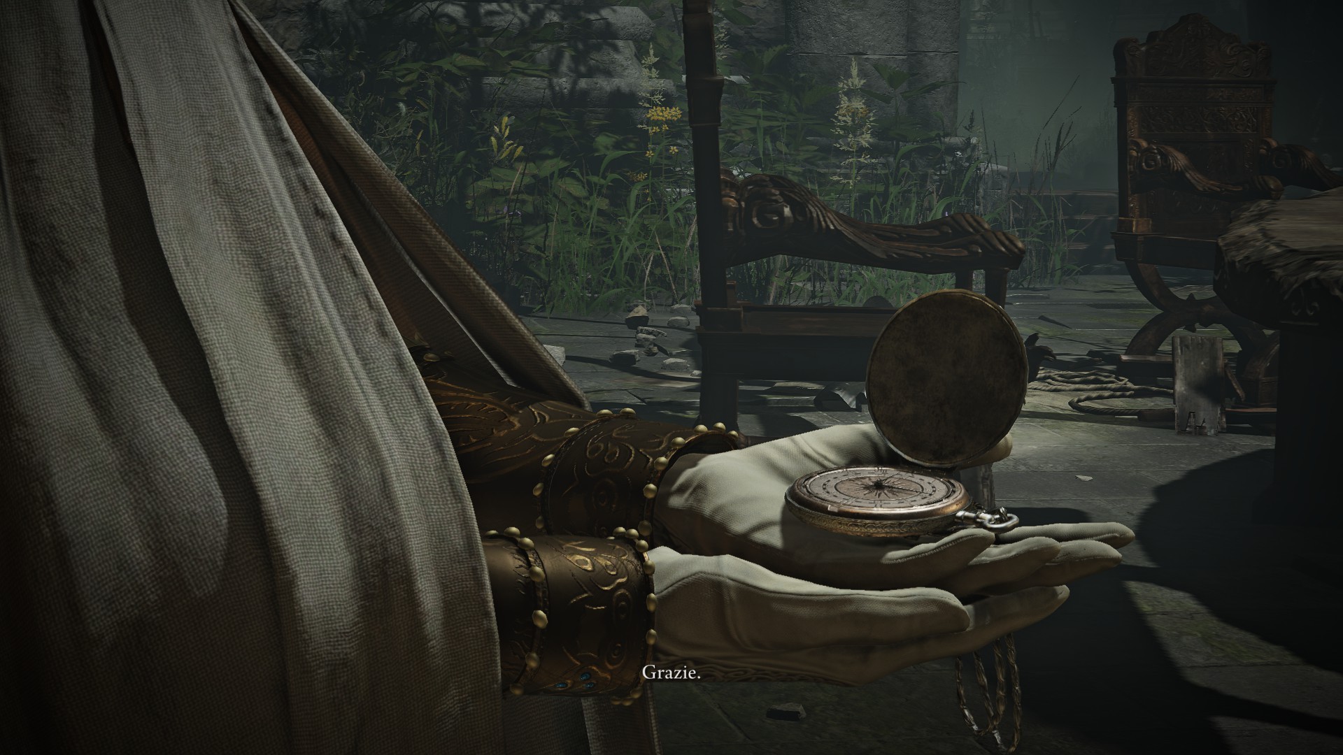 Con l’Orologio da Tasca Antico in mano, possiamo sbloccare una nuova opzione di dialogo con la Sacerdotessa una volta tornati alla Rocca della Tavola Rotonda. Parlate con la figura incappucciata accanto al tavolo delle spedizioni e quando vi viene richiesto, selezionate “Mostrale l’orologio da tasca antico”.