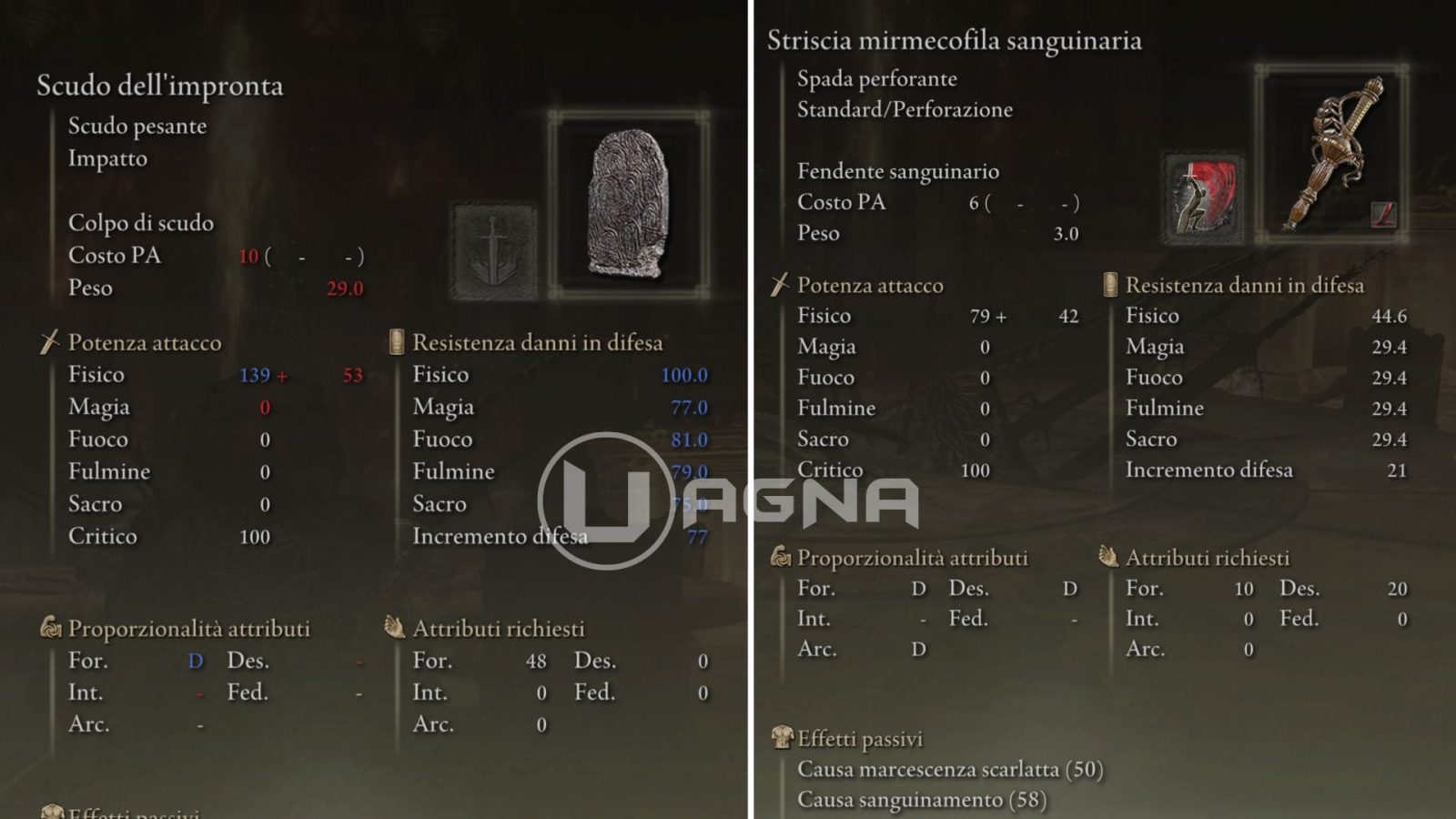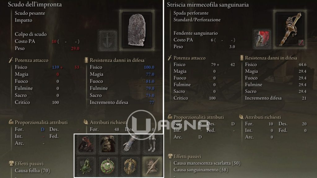 Lo scudo dell’impronta è uno scudo pesante, davvero efficacissimo per la nostra build (sì, sarete in assetto pesante ma non preoccupatevi, ne vale la pena). Vi permetterà di  non cedere terreno e di subire davvero pochi danni. Non c’è bisogno di potenziarlo, già così com’è farà al caso nostro. Potrete trovarlo in Elden Ring, nel gioco base, dopo aver battuto Mohg Il Presagio, nell’area dove dovrete scendere saltando giù da un piano all’altro (fa parte della quest di Hyetta, qui la guida completa).