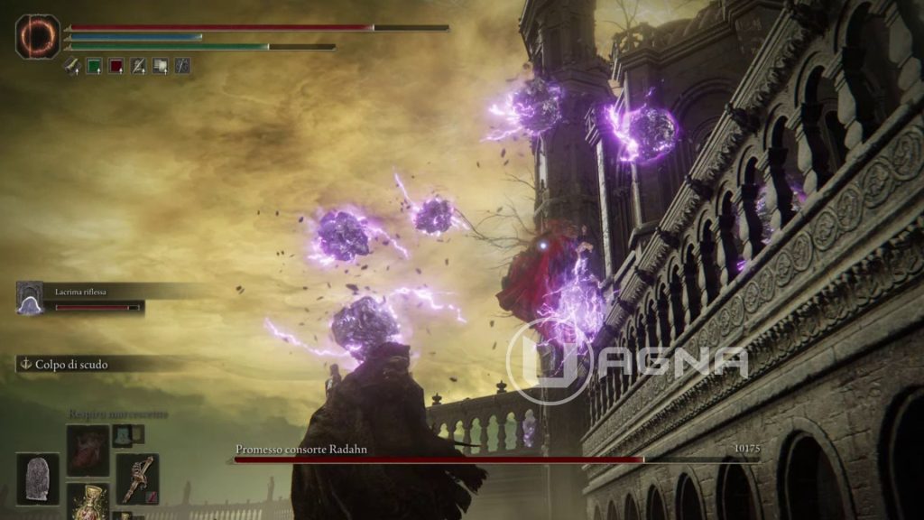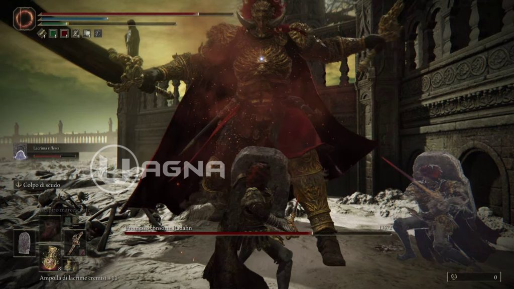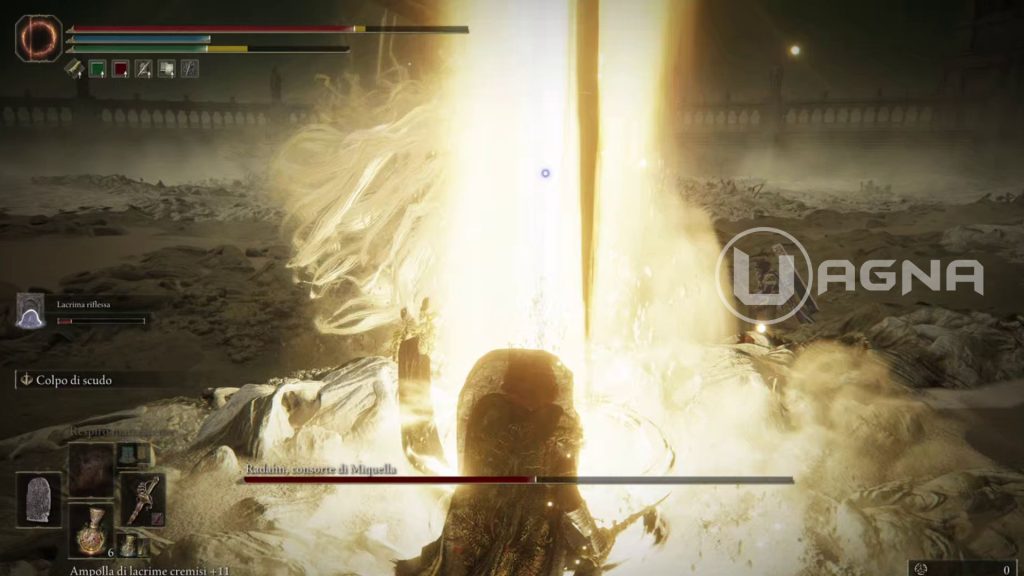 Il boss finale del DLC ha due fasi ben distinte. La prima terminerà dopo aver quasi prosciugato meno della metà dei PV di Radahn. La vostra strategia comunque non cambierà, con la build scudo a torre-lancia/stocco che ci siamo costruiti accuratamente.