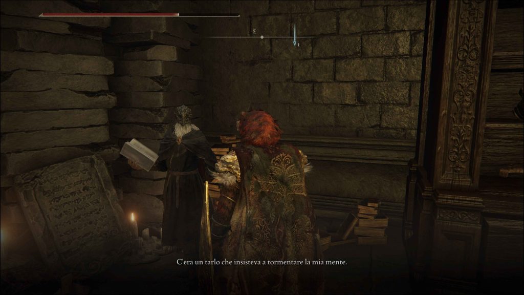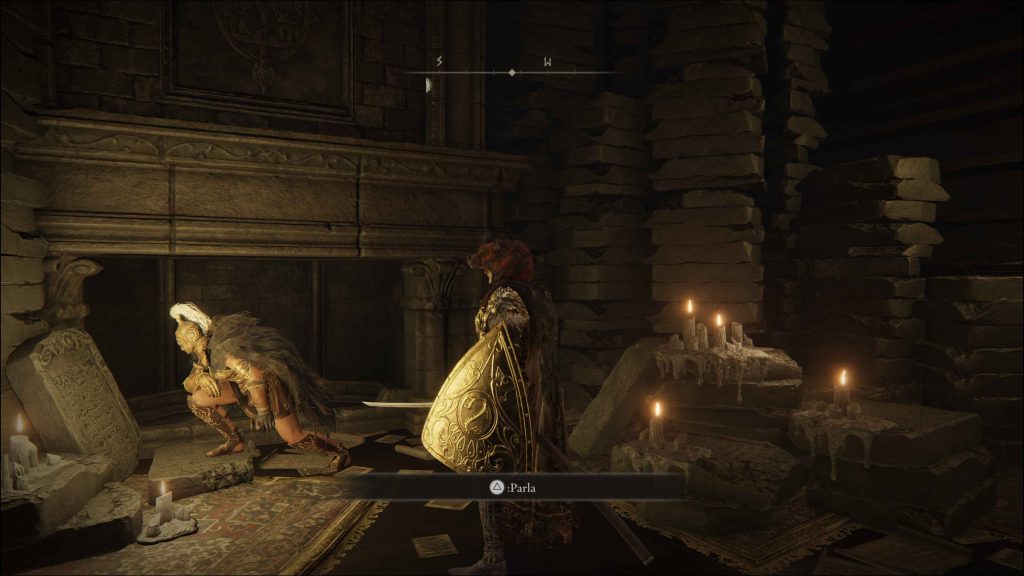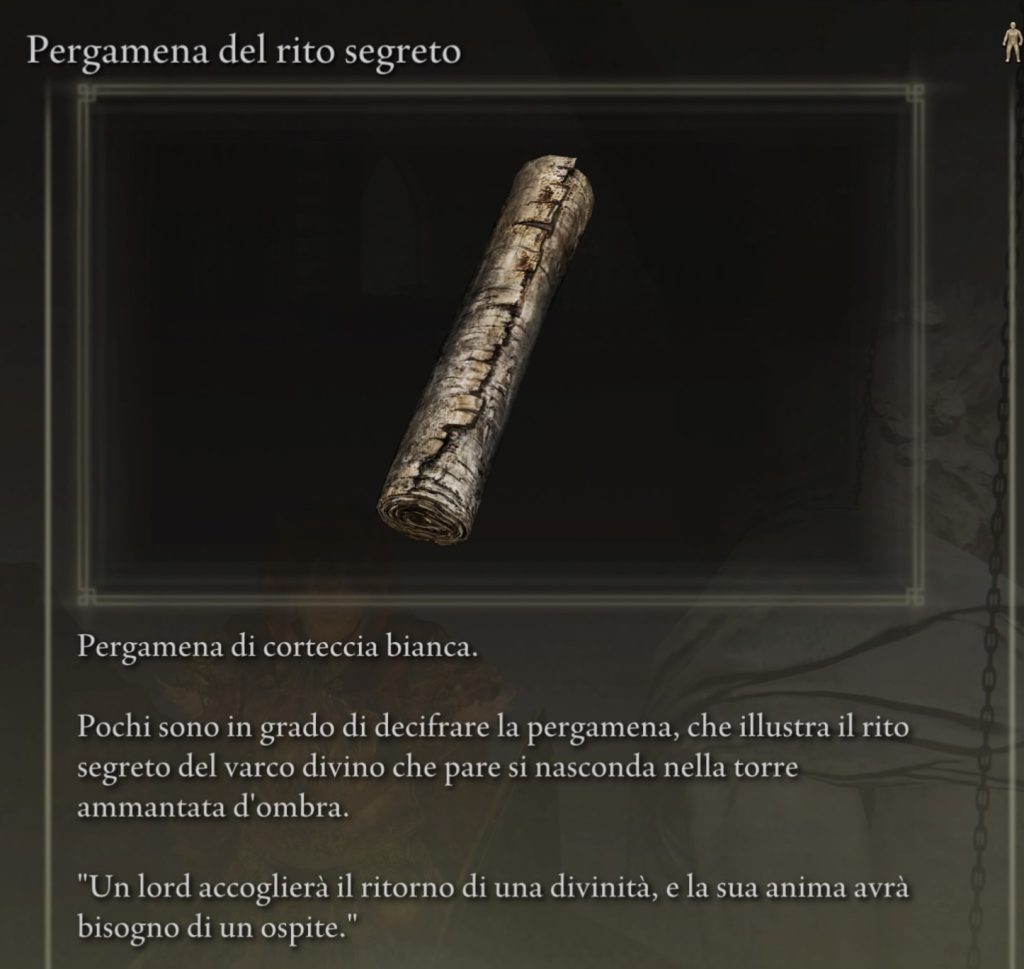 Raccogliete l’oggetto chiave Pergamena del rito segreto al quarto piano del magazzino, sempre presso la Rocca delle Ombre. Dal Luogo di grazia de Quarto piano, dovrete dirigervi verso il nemico vestito di rosso che usa fuoco e fede, oltrepassarlo, scendere le scale a sinistra, entrare nella stanza subito a destra e troverete l’oggetto su un tavolo.