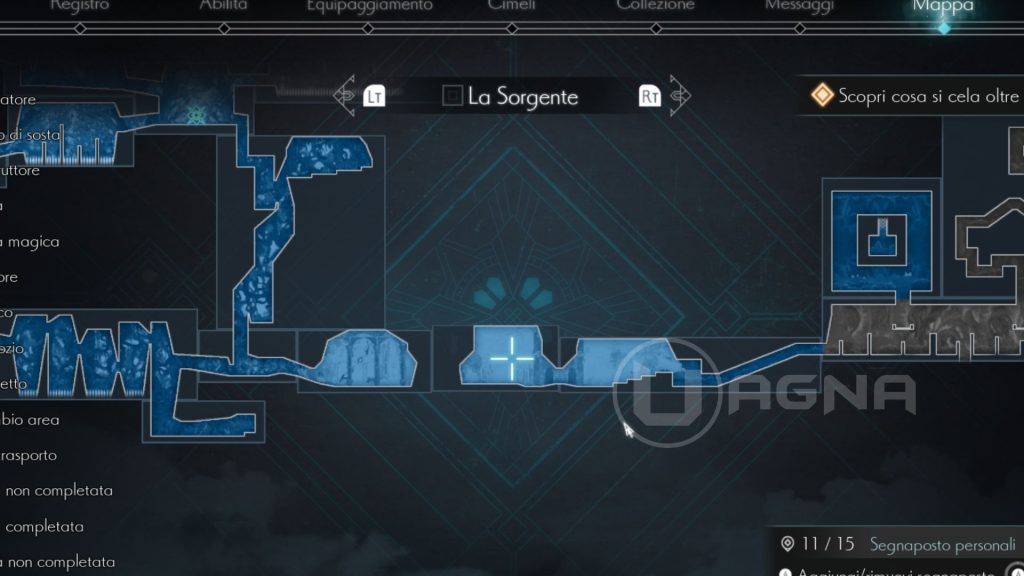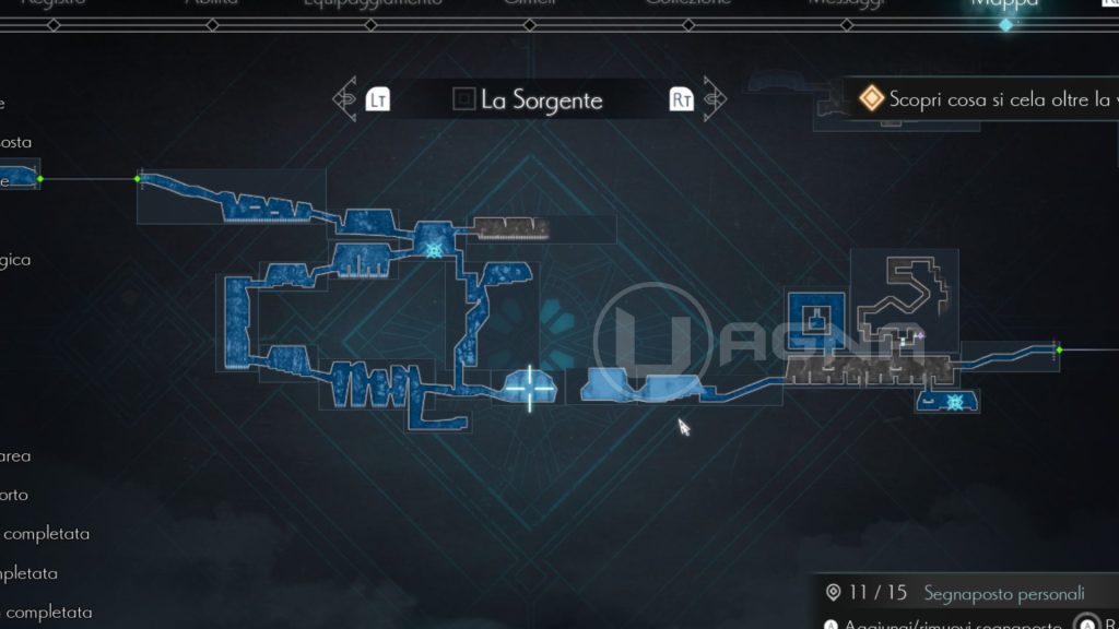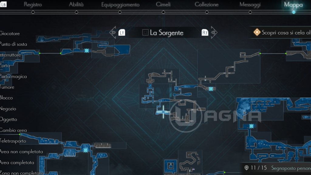 6. Interagite con Lilia nella Sorgente (qui sotto il punto esatto dove la troverete). Si accede dalla Discarica, attraverso l’acqua putrida. Avrete bisogno di parecchia vita per sopravvivere (e magari qualche cura extra grazie al Supporto Ilios). Non eravamo al livello 60. Per rompere la barriera tra la Discarica e quest’area della Sorgente utilizzate la forza subacquea di Motley.