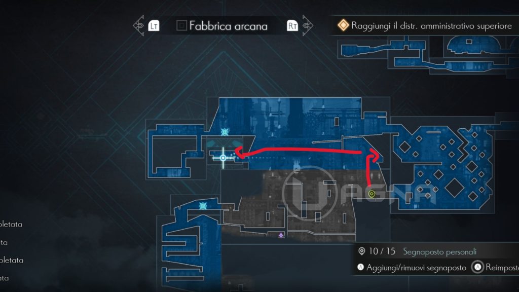 2. Recuperate lo Stemma del capo del clan Milius dalla Fabbrica Arcana: nel punto indicato qui sotto, schizzate in alto con l’abilità potenziata di Garm per finire su una piattaforma sulla destra. Aggrappatevi al muro e con l’abilità di Lars irrompete verso sinistra e distruggete il tumore in fondo all’area, così da raggiungere la zona più a sinistra e raccogliere l’oggetto. Avrete ora un nuovo obiettivo: “Raggiungi il distr. amministrativo superiore”.