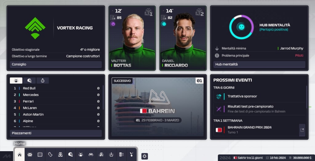 Un’altra novità significativa di F1 Manager 2024 è il nuovo sistema di monitoraggio della mentalità dei piloti e del personale specializzato. Questo parametro misura le prestazioni, le abilità di negoziazione e il tasso di sviluppo, ed è fortemente influenzato dal nostro stile di gestione e dalle condizioni della vettura. I piloti sono particolarmente sensibili alle performance delle loro auto e alle posizioni ottenute in gara, e tutto questo è tracciabile attraverso il Mentality Hub, un nuovo strumento che offre una visione dettagliata dello stato d’animo e delle performance del team.