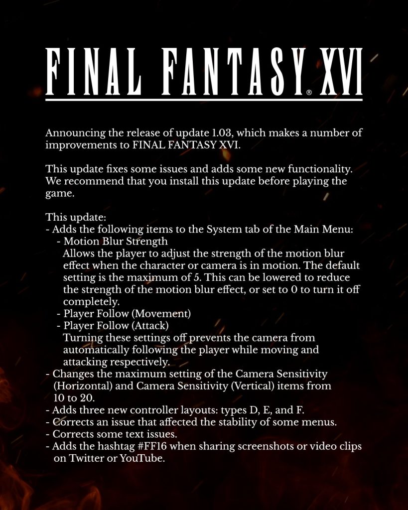 Proprio per cercare di ottimizzare sempre di più la sua ultima fatica, Square Enix ha recentemente pubblicato un nuovo aggiornamento, che porta il gioco alla versione 1.03. Tale update va ad intervenire su diversi aspetti tecnici, uno dei quali consente ai giocatori di poter limitare o addirittura disattivare il motion blur. Tale intervento si è reso necessario a seguito delle numerose richieste degli appassionati che, mal tollerando la sfocatura del movimento, hanno pregato la casa di sviluppo giapponese di aggiungere l’opzione.