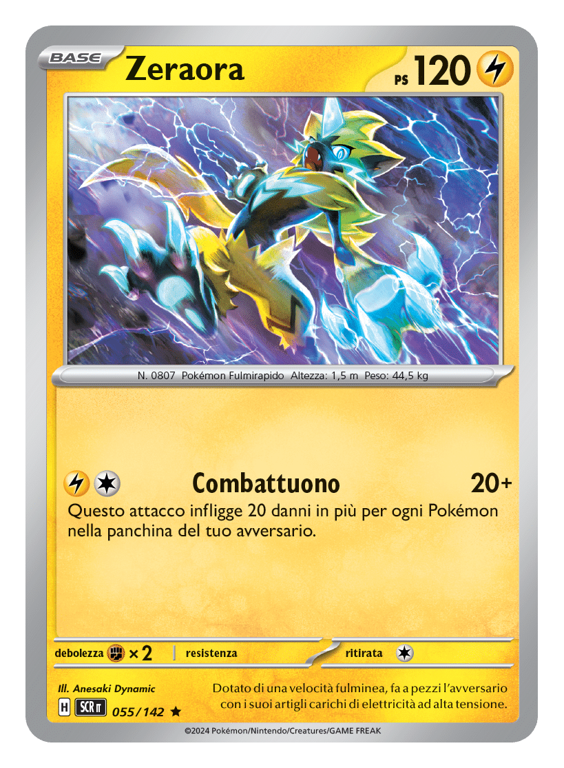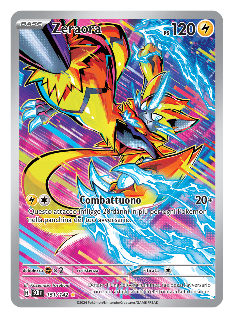 Ebbene, in anteprima possiamo svelarvi due delle carte Pokémon-ex presenti, ossia Zeraora base e nella sua strabiliante versione Full Art! Il Pokémon di tipo Elettro introdotto durante la settima generazione presenta come mossa offensiva Combattuono, capace di infliggere gravi danni a seconda dei Pokémon presenti nella panchina dell’avversario.