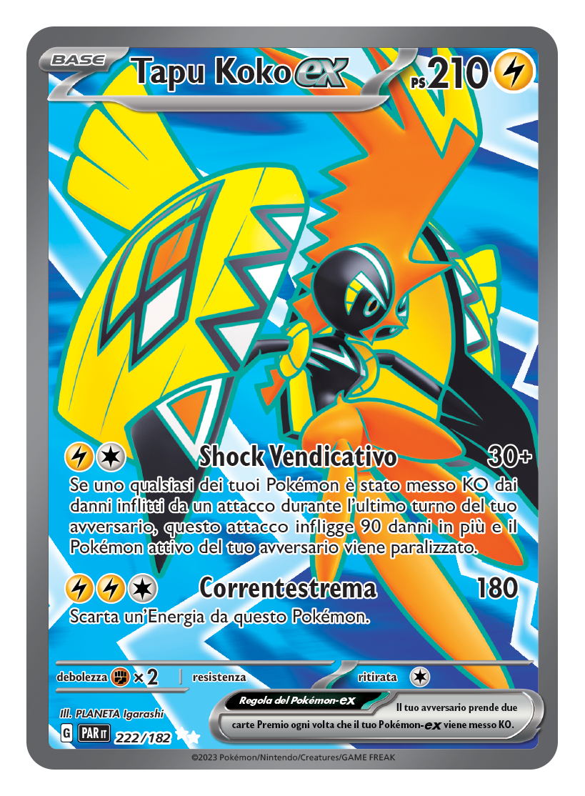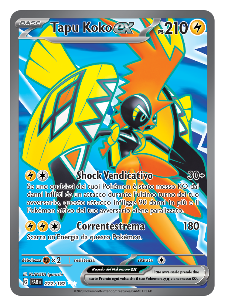 Ebbene, in anteprima possiamo svelarvi una delle carte Pokémon-ex presenti, ossia Tapu Koko! Il Pokémon leggendario di doppio tipo Elettro/Folletto introdotto durante la settima generazione presenta due attacchi devastanti denominati Shock Vendicativo e Correntestrema, capaci di ribaltare le sorti della battaglia qualora l’avversario avesse inferto gravi conseguenze ai Pokémon del giocatore.