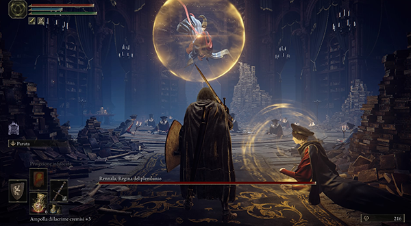 Una volta colpite tre seguaci di Rennala, vedrete che gli attacchi cesseranno e la maga cadrà dal cielo, inerme, permettendovi di colpirla brutalmente: non abbiate pietà, perchè ben presto la maga ripristinerà la sua bolla d’oro e ricomincerà a fluttuare, costringendovi a ripetere il procedimento. Fate attenzione all’onda d’urto che vi colpirè quando la maga ripristina la bolla, cercate di allontanarvi per tempo. Tornata in alto, la maga potrebbe anche bersagliarvi con un potente incantesimo bianco, cercate di evitarlo a tutti i costi nascondendovi dietro qualcosa o rollando.