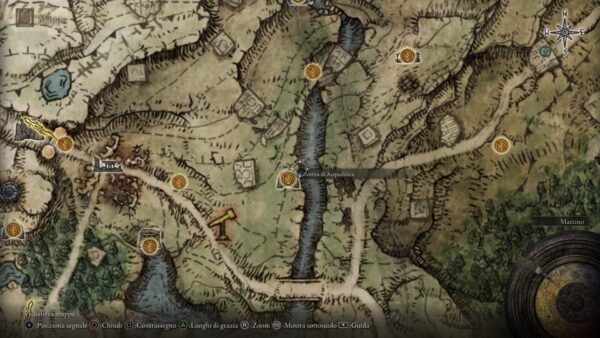 Oltre a far pratica e a potenziare il proprio personaggio, esiste un oggetto molto utile durante la battaglia con Margit. Il suo Sigillo, se equipaggiato in uno slot della nostra praticissima borsa, ci consentirà di superare la prima fase del boss in men che non si dica. Per trovare il Sigillo di Margit dovrete recarvi nella zona indicata qui sotto nella mappa, precisamente all’interno della Caverna di Acquafosca. Non è un luogo lontano o difficile da raggiungere nelle prime fasi di gioco, ma ci sarà comunque un nemico abbastanza fastidioso a sbarrarci la strada: davanti all’ingresso della Caverna (segnato da un fuoco acceso) verremo invasi dalla cacciatrice Yura. Sconfiggetela (per fortuna ben presto arriverà un alleato a darvi man forte) ed entrate nella Caverna. Non si tratta di un luogo particolarmente pericoloso, dovrete infatti procedere lungo una galleria a destra per raggiungere una nebbia dorata e scontrarvi con… sì, è proprio lui!