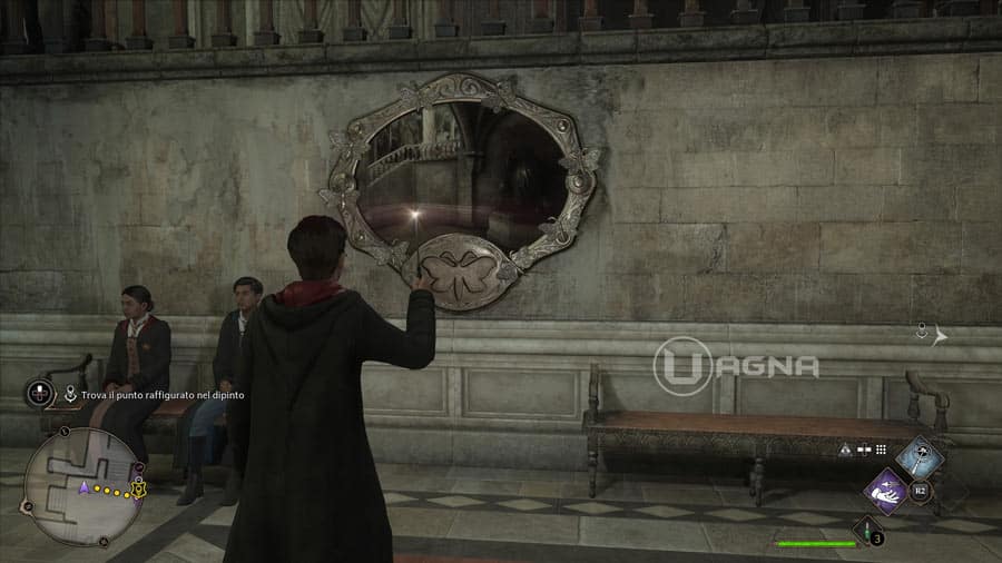 Per completare la missione secondaria, come prima cosa mettetevi di fronte al dipinto, lo stesso che Lenora ha segnalato (lo vedete nell’immagine qui sotto). Con l’apposito comando (su PlayStation è R2 + Triangolo) attivate Lumos, e il dipinto mostrerà una particolare sezione del castello di Hogwarts. Come forse avrete già intuito, il vostro obiettivo è ora raggiungere questa zona, in realtà non distante da dove vi trovate.