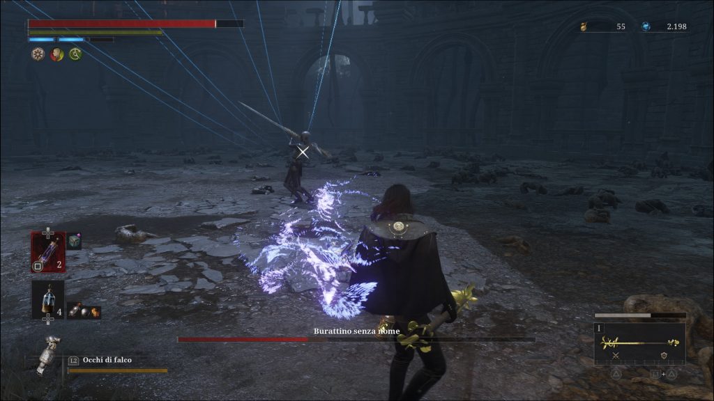 Anche in questo caso riuscirete a staggerare l’avversario grazie a qualche parata e qualche colpo ben assestato. Inoltre, se ben vi siete equipaggiati prima dello scontro, avrete dalla vostra un buon numero di oggetti da lancio. Anche il Braccio a Legione Occhio di Falco vi sarà utile per colpire l’avversario stando alla dovuta distanza (oppure, paratevi con Aegis se preferite). Dovreste riuscire ad eliminare circa metà dei suoi PV semplicemente standogli lontano.
