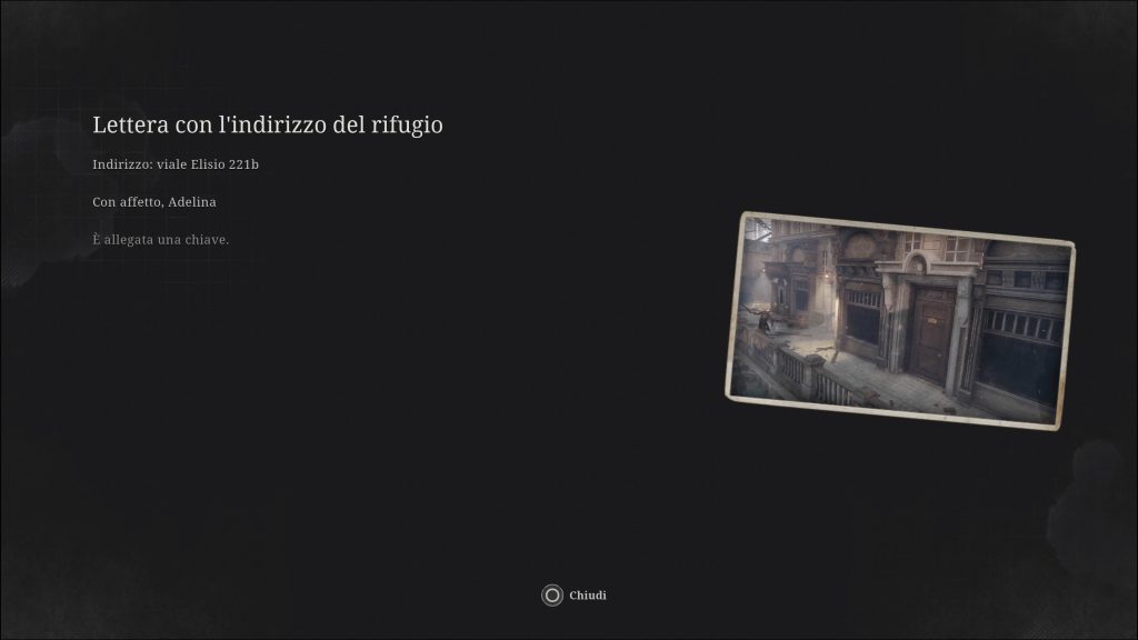 Il nostro obiettivo è l’appartamento 221B, lo troverete subito fuori dalla balconata se partite dallo Stargazer Interno della Casa di Viale Elisio (dove c’è l’imboscata dietro al nemico rivolto verso l’esterno della balconata).