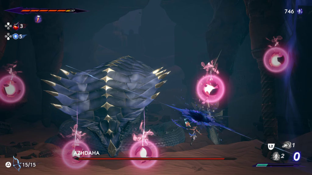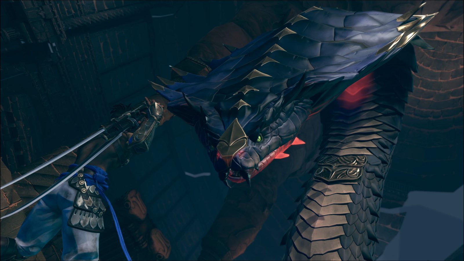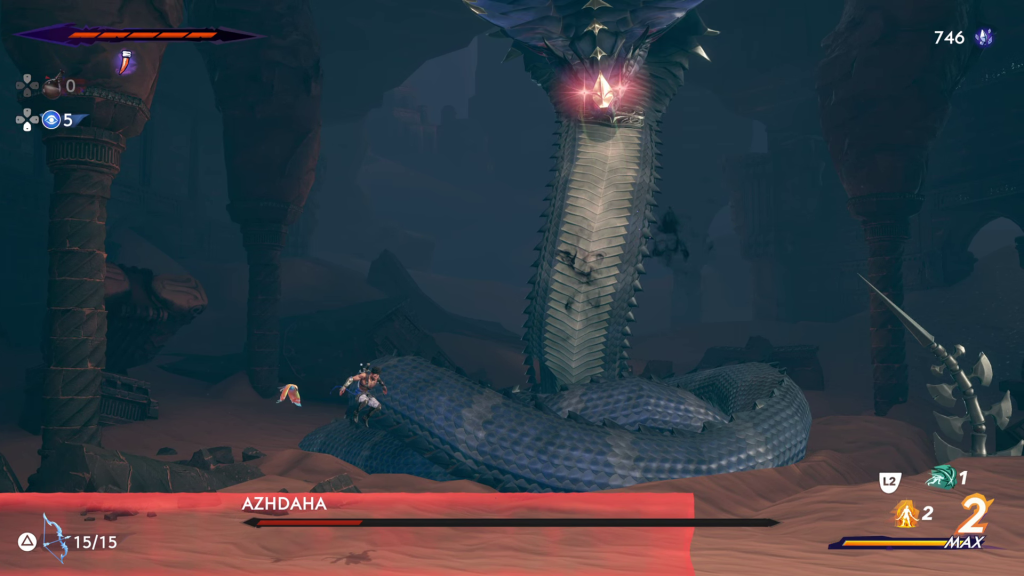 Questa parata tuttavia è un po’ tricky, in sostanza dovrete prima saltare per evitare la coda e poi, mentre siete in aria, parare il testone del nemico. Molto soddisfacente. Se invece mancherete la mossa, il serpente vi farà un gran male quindi cercate di non perdere l’occasione. La boss fight finirà molto prima se riuscirete a parare mentre ha gli occhi gialli.