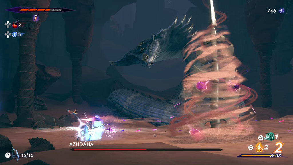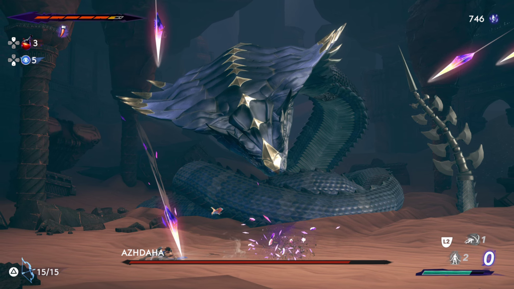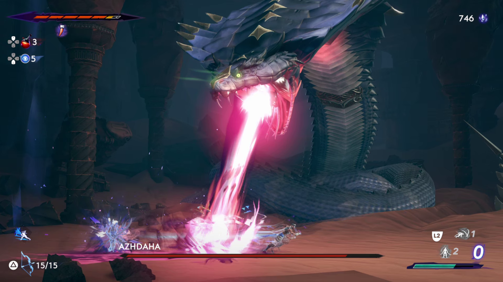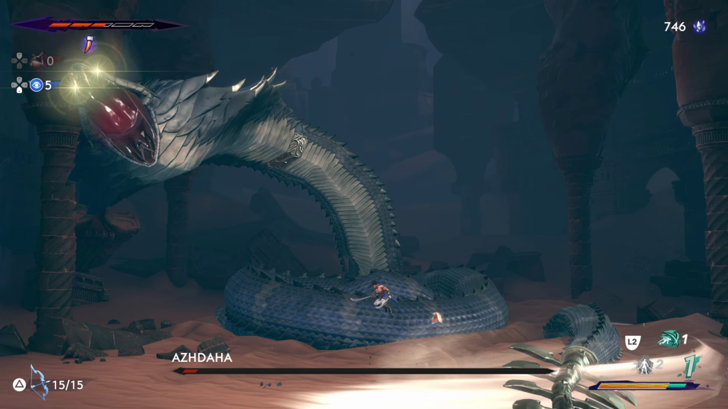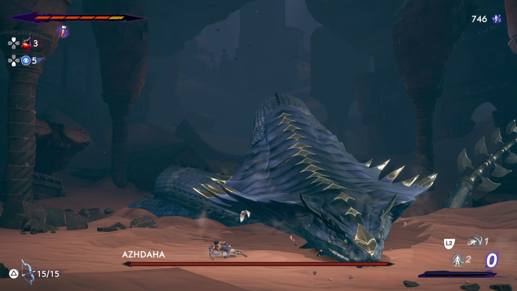 Una volta spezzati i due sigilli dorati che ci impediscono di proseguire verso il basso nelle Sabbie Eterne (dovrete affrontare due sezioni platform per raggiungere i sigilli, una caratterizzata da delle cascate di sabbia presidiate da giganteschi scarabei e l’altra con delle trappole che tenteranno di schiacciarvi), vi ritroverete faccia a faccia con Azhdaha.