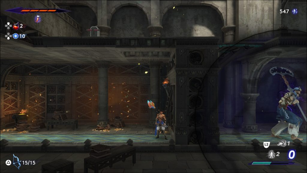 Per avere una chance contro questo fastidiosissimo nemico, dovrete proseguire con le missioni principali della storia fino a quando vi verrà chiesto di rompere dei sigilli dorati per raggiungere le Sabbie Eterne. Per farlo, dovrete guadagnare due nuovi poteri per manipolare il tempo. Sargon, in particolare, dovrà avere accesso al potere Preveggenza, che gli permette di entrare in una dimensione alternativa (premete R3) così da aprirsi nuove strade manipolando l’ambiente.