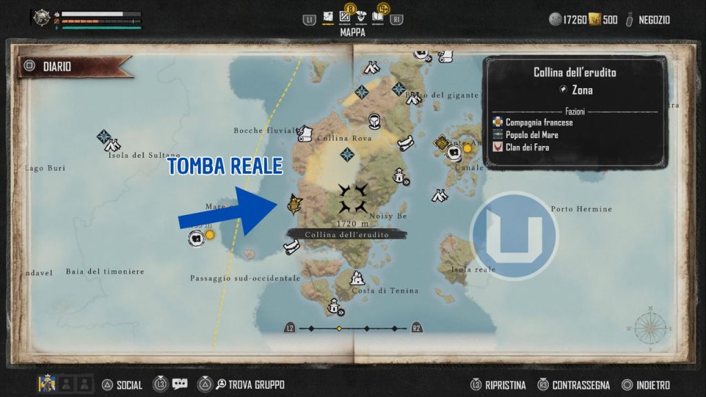 Il primo passo per ottenere la Taglia di Caradec è recarsi a Tomba Reale, un avamposto situato sul lato ovest dell’Isola Rossa (un altro riferimento utile è la Collina dell’Erudito, la nostra meta è a nord-ovest di qui). Per maggiore chiarezza, vi lasciamo una mappa che illustra la posizione esatta – una piccola nota: i giocatori che hanno già visitato questo luogo possono utilizzare il viaggio veloce di Skull and Bones per tornare qui rapidamente.