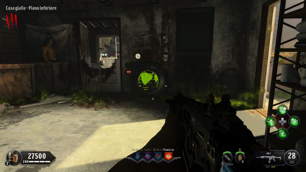 Interagite con Rushmore (come al solito). Ci saranno ora tre quadri in giro per la mappa dai quali inizierà a fuoriuscire un fumo verde. Quello che dovrete fare è portare uno zombie di fronte ad uno di questi quadri e colpirlo con l’arma potenziata con Trasformato (ecco perché il consiglio iniziale che vi ho dato), e questo attaccherà automaticamente il quadro buttandolo a terra. Sulla parete troverete un codice: segnatevelo, perché ovviamente dovrete inserirlo poco dopo in Rushmore. I quadri sono posizionati in: