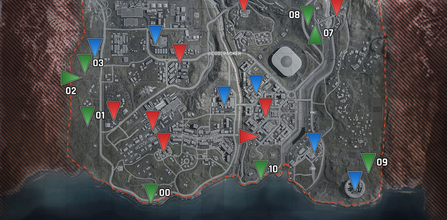 In queste pratiche mappe, realizzate da CODTracker, potete dare uno sguardo alle precise posizioni di bunker (in colore verde), telefoni (rossi) e computer (blu) che si possono trovare all’interno della mappa di Verdansk.