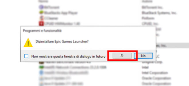 - Cercate l’Epic Games Launcher, selezionatelo (facendo click su di esso) e cliccate Disinstalla, presente nella barra in alto, confermando scegliendo Si