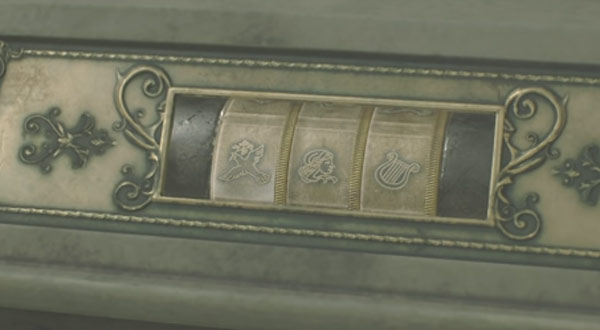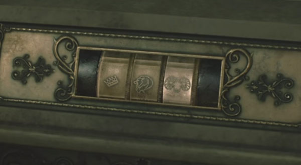 Salite le scale con Leon, troverete una statua di un leone con la zampa su uno stemma, e sotto di esso una combinazione a tre pannelli da ruotare. Ovviamente dovrete interagire con la statua, e poi ruotare ognuno dei tre pannelli della combinazione per far uscire fuori la sequenza esatta. La sequenza corretta per completare questo primo puzzle è: Corona, Cane, Ariete. Una volta inserita la sequenza esatta, la statua rivelerà il Medaglione del Leone, che potrete recuperare. Ecco, qui sotto, anche la sequenza corretta nell’immagine.