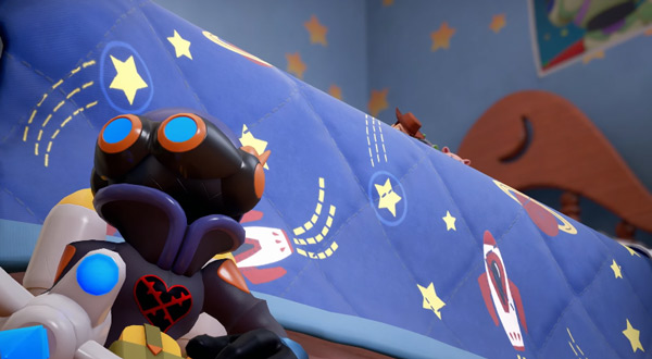 La scena si sposta ora, per un breve momento, nella camera da letto di Andy, dove vediamo Buzz Lightyear, Woody, Rex e Hamm appostati sul letto del ragazzo mentre pianificano di attaccare un Heartless che sta facendo la guardia. Prima che si decidano ad entrare in azione, però, qualcosa sotto il letto si muove: si tratta di Sora, Paperino e Pippo, che esattamente come abbiamo visto nel trailer dedicato a Toy Story vanno ad attaccare i mostri apparsi nel mondo dei giocattoli. Possiamo quindi desumere che quella che abbiamo appena visto sia la primissima scena che vedremo nel mondo ispirato al film Pixar, con i personaggi che stanno facendo i conti con l’invasione Heartless. A tal proposito, il filmato ci permette di dare uno sguardo più ravvicinato agli esseri oscuri, molto dettagliati e che ancora una volta si adatteranno al contesto di ogni mondo. L’Heartless chee vediamo qui, ad esempio, appare con una forma molto “giocattolosa”, con tanto di retrorazzi, pistola di plastica e casco protettivo.