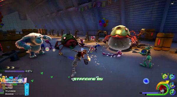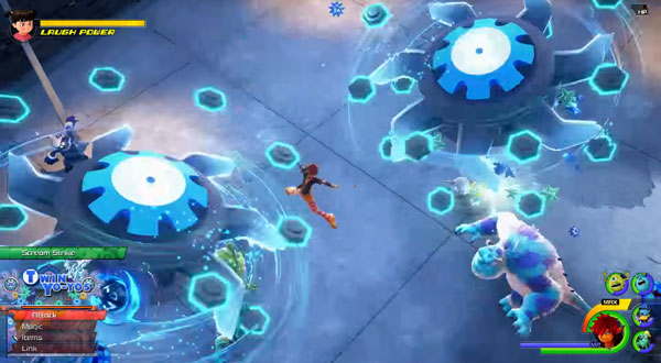 Torniamo quindi ora alla Monsters Inc. dove assistiamo ad una nuova battaglia contro gli Heartless tra cui riconosciamo i Soldato e i Blu Ciccio. È l’occasione giusta, per il trailer, per mostrarci altri tipi di attacco di cui saremo dotati, il che contribuisce all’idea che i combattimenti in Kingdom Hearts III saranno estremamente variegati e con tante possibilità. Vediamo infatti la mossa speciale Twin Yo-Yos, che come suggerisce il nome trasforma il Keyblade in due yo-yo con i quali è possibile attaccare i nemici e finirli con una potente combo conclusiva che trasforma gli yo-yo in una sorta di tenaglie che rinchiudono il mostro. Osserviamo inoltre Sora alle prese con il “nuovo” Flowmotion, il sistema di movimento e attacco introdotto nel capitolo su Nintendo 3DS e che era già stato confermato su Kingdom Hearts III, mentre sfrutta alcuni pali per colpire più nemici contemporaneamente roteando velocemente attorno ad esso. L’ultimo attacco speciale che vediamo, davvero esilarante, ha come protagonista Mike Wazowski che viene utilizzato, data la sua forma sferica, da Sora come una palla da bowling per colpire un grosso numero di Heartless messi alle strette davanti ad un muro.