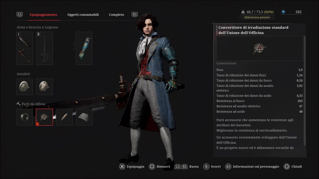 Ciò che invece cambia di molto le carte in tavola sono le armi che sceglierete per combattere e gli equipaggiamenti difensivi, così come il Braccio a Legione. Le armi in Lies of P sono formate da una impugnatura e una lama che potrete combinare come più vi aggrada, ogni Braccio a Legione invece ha delle abilità uniche: scegliete quello che vi piace di più, createne di nuovi presso Venigni, sperimentate con gli equipaggiamenti di difesa, divertitevi (ma occhio al peso trasportato!).
