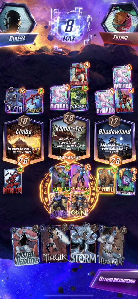 L’utente ci ha raccontato in esclusiva le sue mosse: dopo aver saltato il primo turno, ha giocato Zabu (diminuisce di 1 il costo delle carte di costo 4) nel campo di destra, che si rivelerà essere poi Shadowland; nel terzo turno ecco Wong (raddoppia gli effetti Alla Scoperta, che quindi vengono quadruplicati nel campo Kamar-Taj) posizionato appunto nel campo centrale, proprio come Ironheart (alla scoperta offre +2 a tre carte alleate, effetto che viene moltiplicato x4 con la combinazione di Kamar-Taj e Wong.