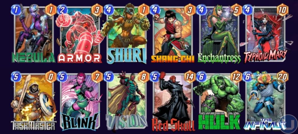 Blink è assolutamente necessaria per arrivare alla vittoria? No, e anzi una strategia vincente può arrivare anche se questa carta resta nel mazzo e non viene pescata. Shuri può raddoppiare la potenza di Red Skull, e quindi Taskmaster può replicare il livello di potenza di 28 in un campo diverso. Questa è una vittoria facile e tirare queste carte è abbastanza comune.